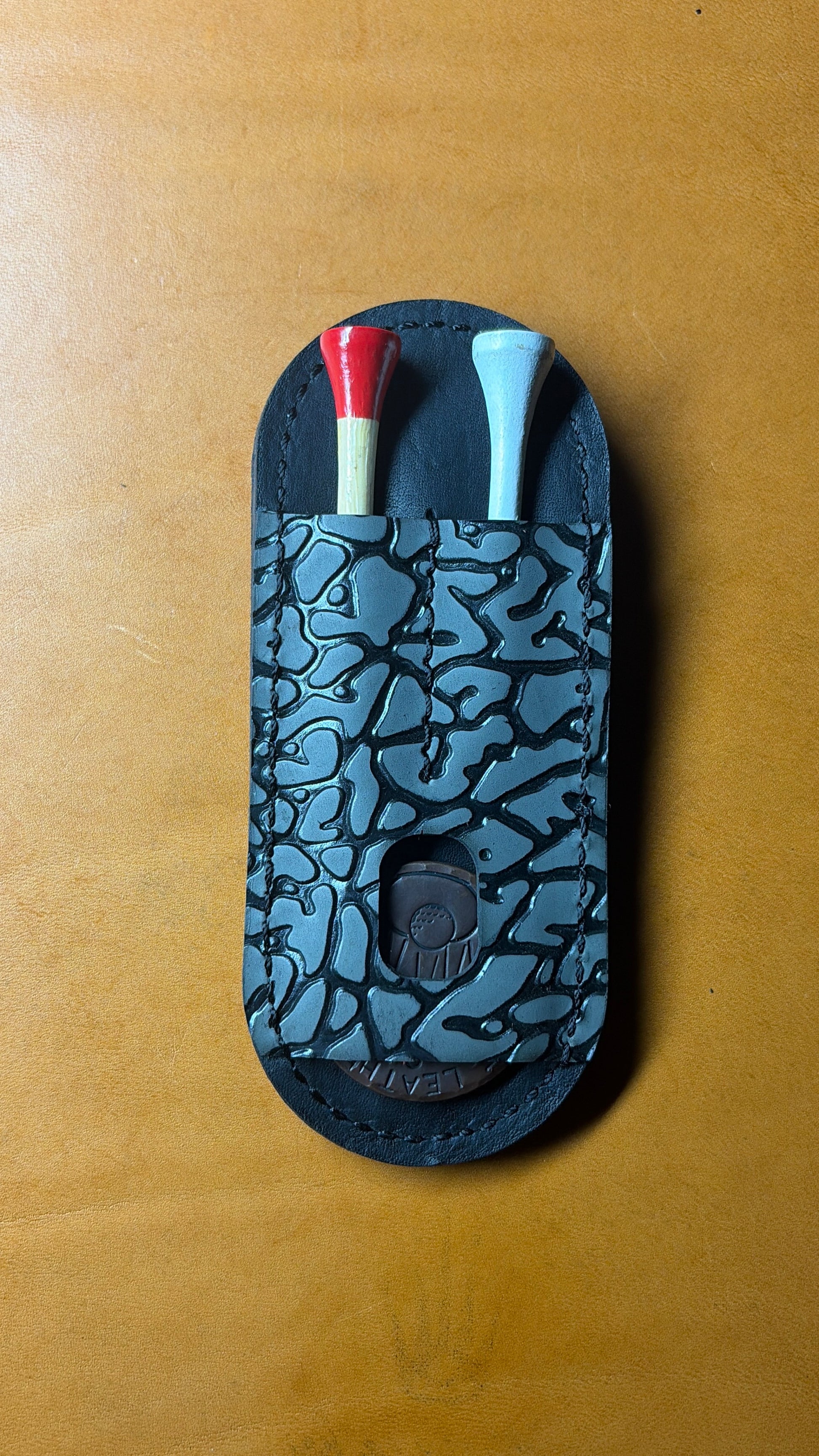 Keep your golf tees and Tomo Golf Ninja divot repair tool securely stored and easily accessible with this exquisite leather Golf Tee Holder.