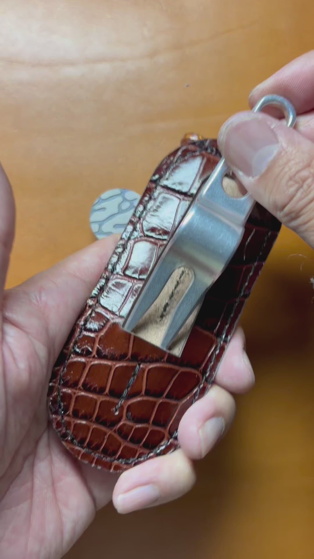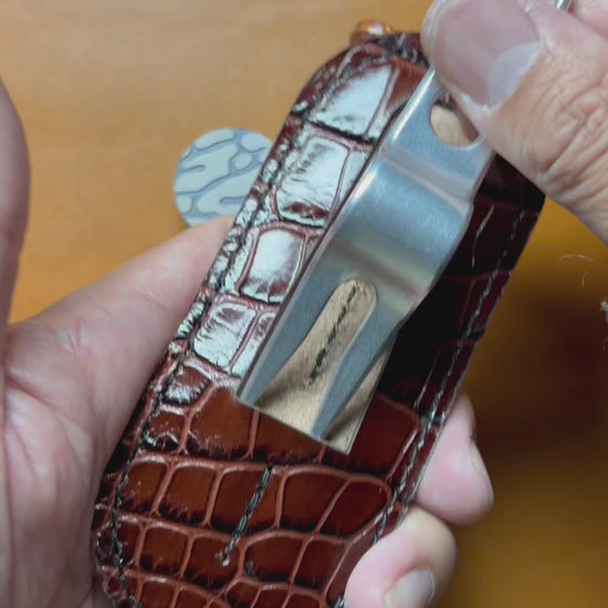 Scotty Cameron Pivot Tool & Golf Tee Holder. Pocket for 1.5 inch Ball Marker. Embossed Crocodile and Natural Veg Tan leather.